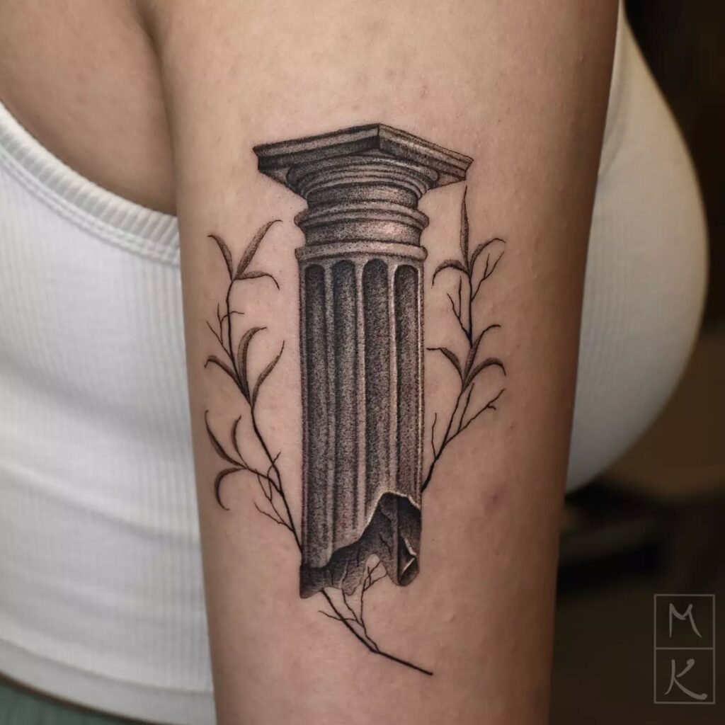 This tattoo portrays a broken Roman column wrapped with delicate vines, blending strength with fragility. The column, though fractured, still stands as a symbol of endurance and the passage of time. The vines add softness, reminding us of nature’s persistence in reclaiming what civilizations leave behind.