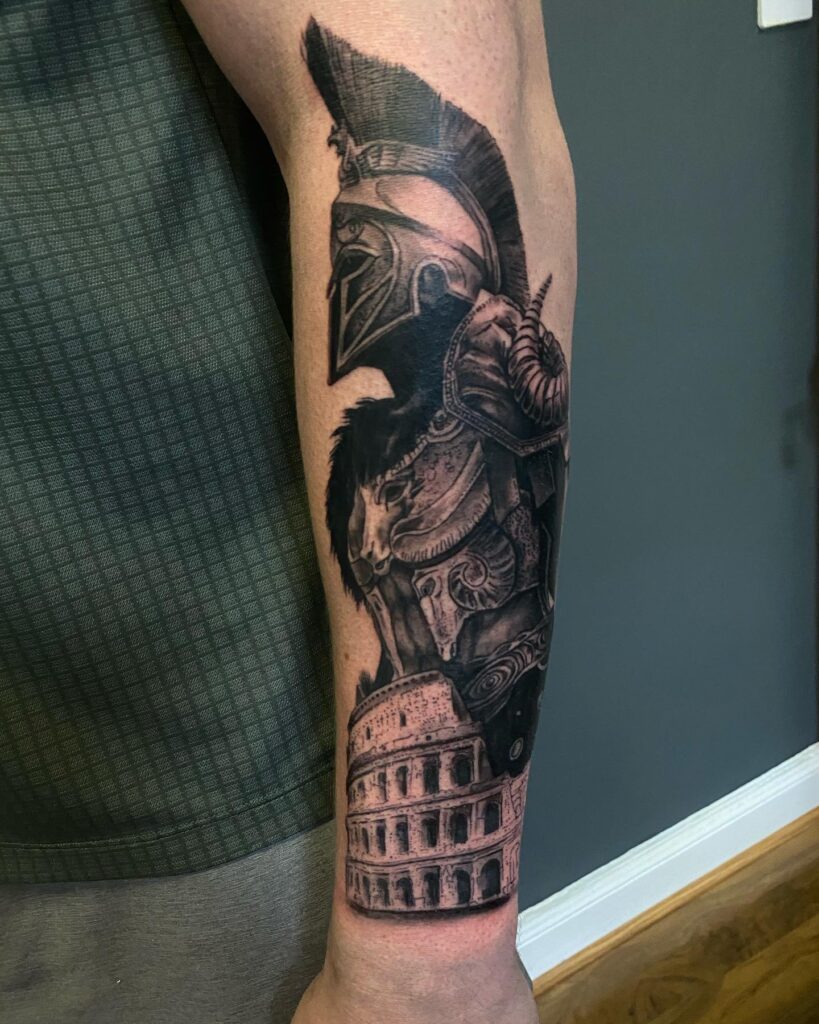 Here, a gladiator in full armor stands boldly above the Colosseum, one of Rome’s most iconic structures. The tattoo merges man and monument, representing both the spirit of the fighters and the empire they entertained. The gladiator’s helmet and wolf pelt cloak bring depth and fierceness to the design.