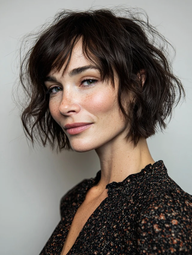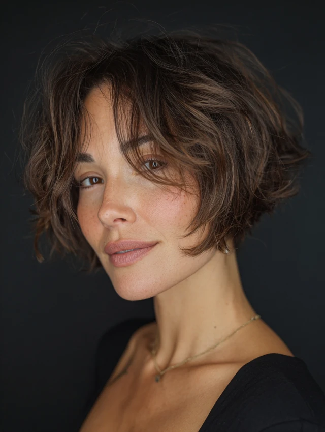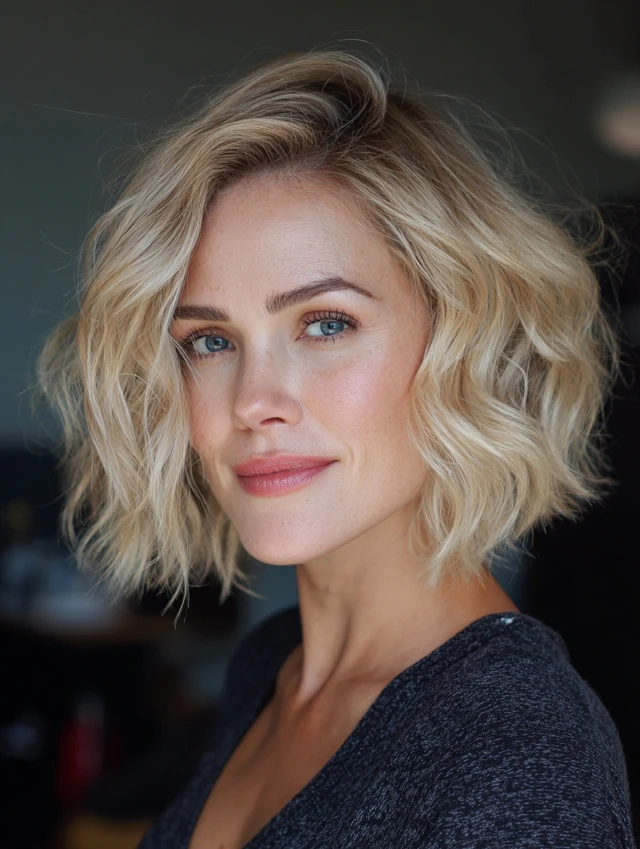 Soft waves, feathered layers, or tousled texture soften sharp facial lines.