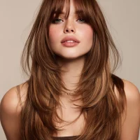 Side-swept bangs add softness and frame the face beautifully.