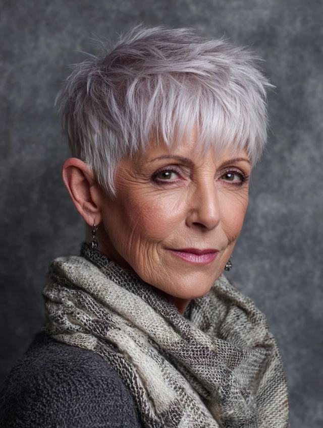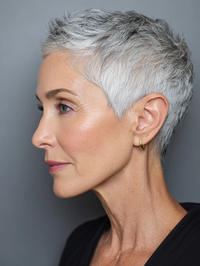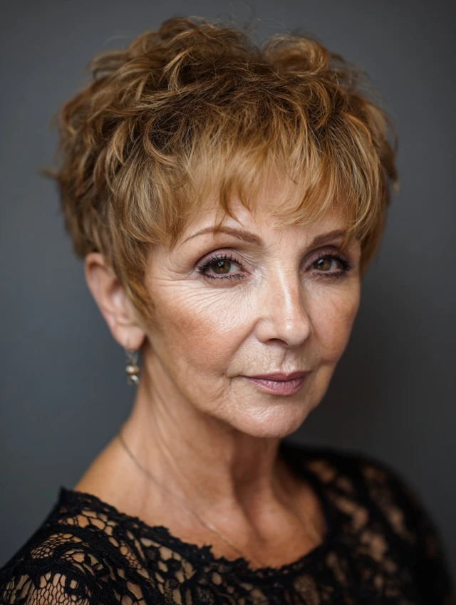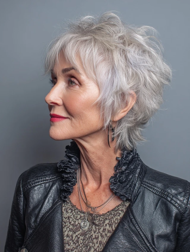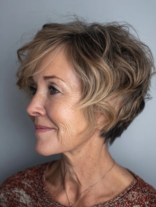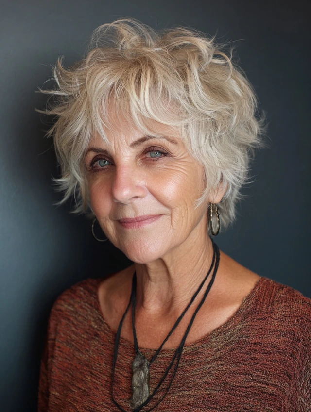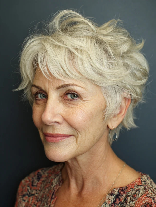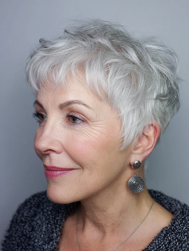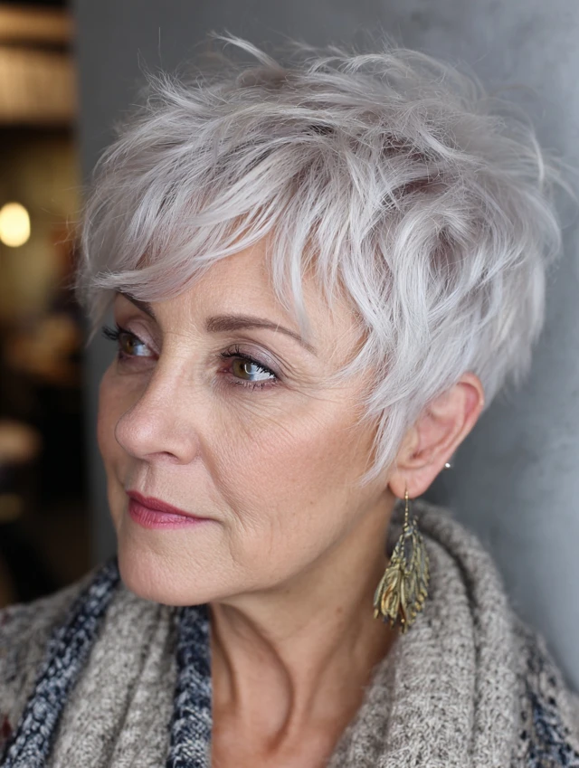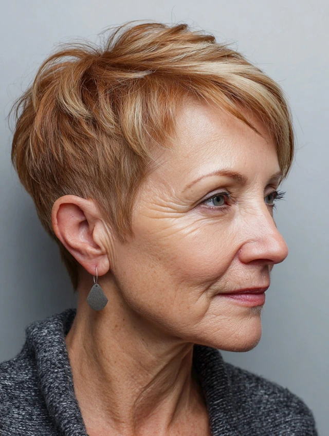 Layered pixie, soft bob, feathered crop, tapered cut, or textured short shag.