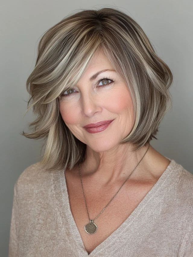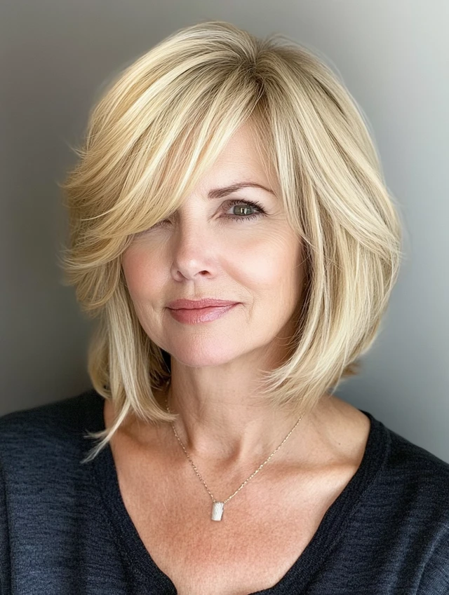 Why it works: Layers add volume without weight, and side bangs help balance forehead lines or fine wrinkles.