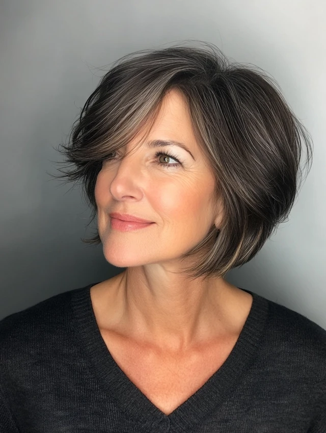 A layered bob that hits just below the ears or at the chin is universally flattering. The side bangs add softness and draw attention to the eyes.