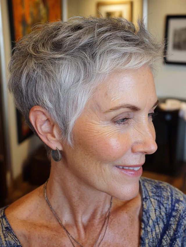 Light, airy, and timeless, the soft pixie gives beautiful lift and flatters mature features. It enhances natural silver shades effortlessly.