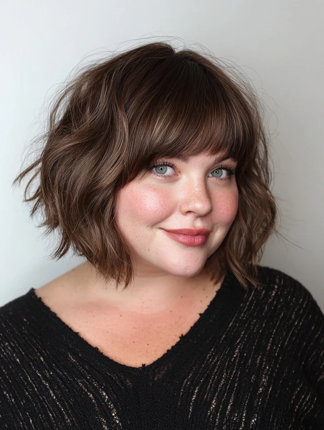 Soft waves and bangs balance fuller cheeks while adding playful texture.