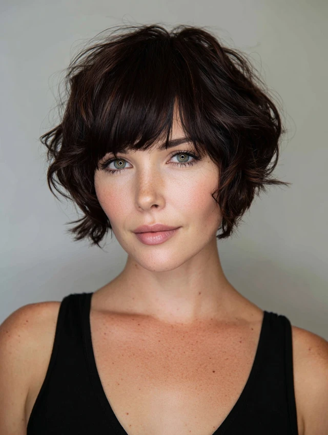 Layered bob, textured pixie, stacked bob, or angled short cut.