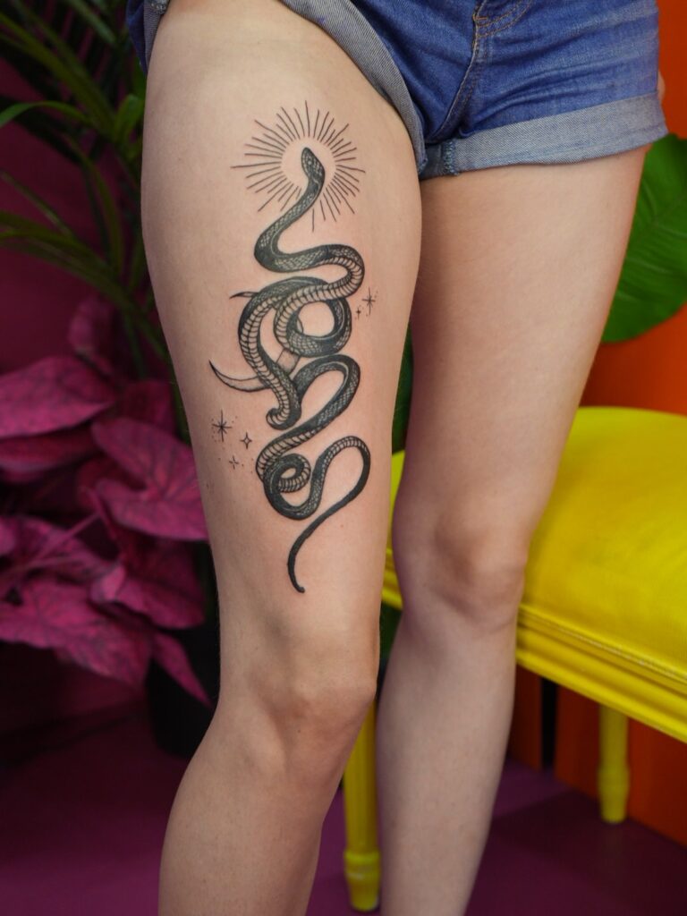 3. Serpent and Cosmic Thigh Tattoo