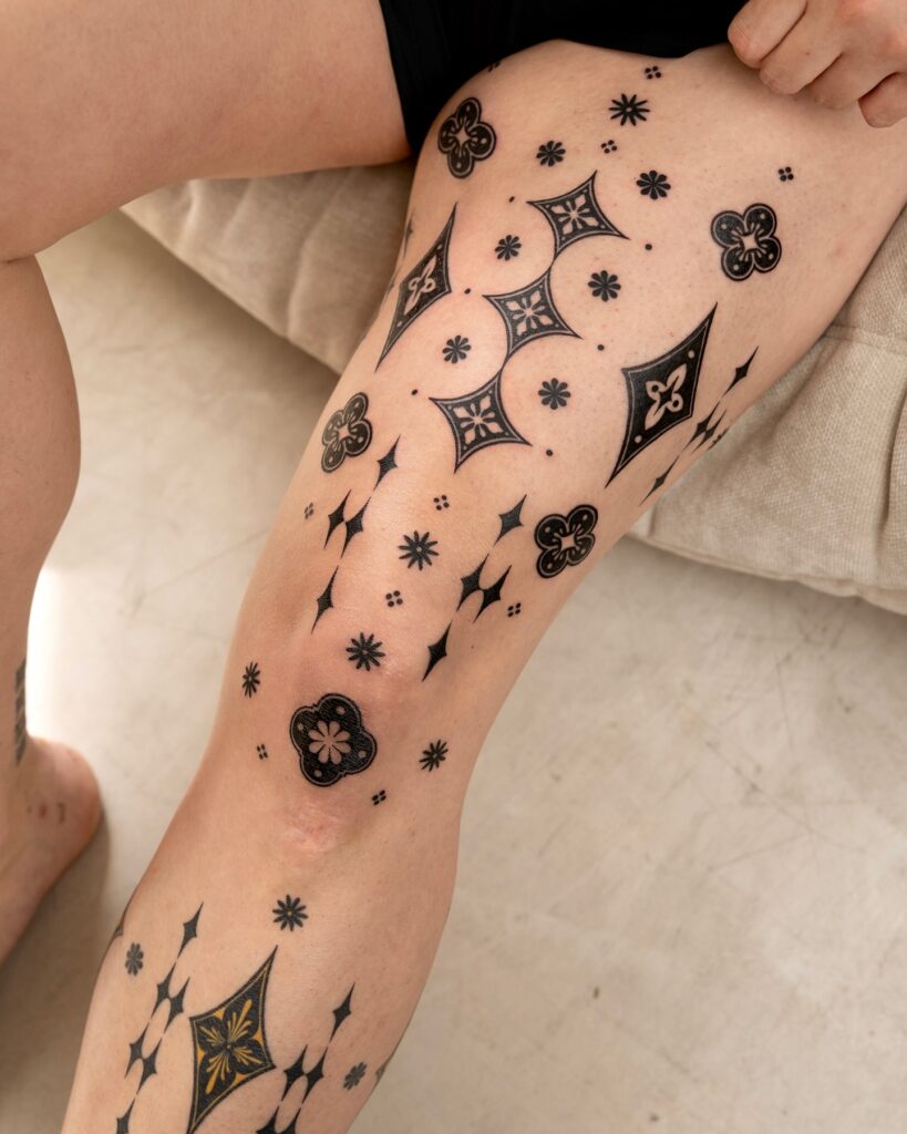 This tattoo embodies individuality and creativity, turning the thigh into a living canvas. Its mix of geometric and star shapes gives it a dreamy, cosmic feel, making it ideal for someone who wants a tattoo that feels playful yet powerful.