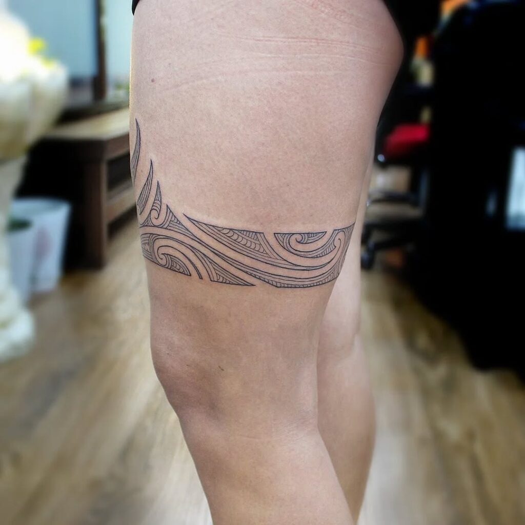 This tattoo features fine-line tribal waves that wrap elegantly around the thigh. The swirling patterns create movement, giving the design a modern and understated look.