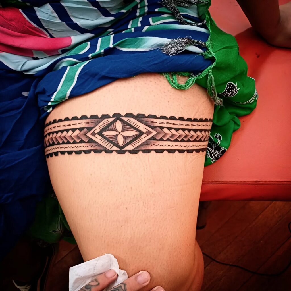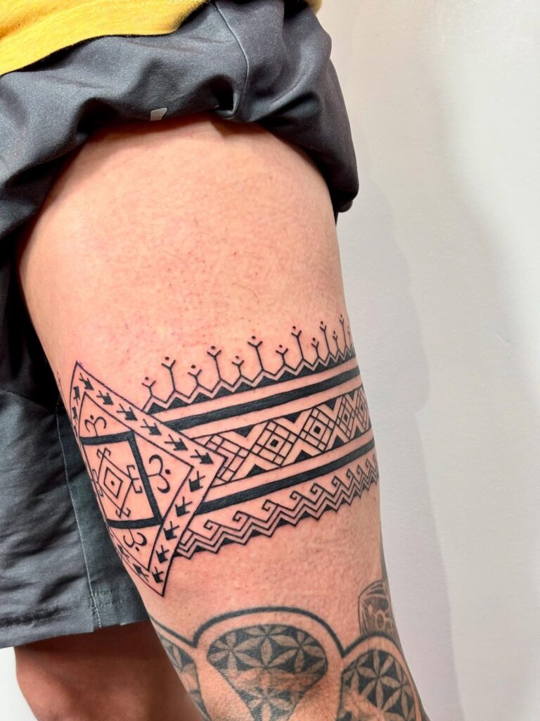 A striking tribal-inspired thigh band features geometric shapes, diamonds, and traditional motifs in bold black ink. Its sharp lines and repeating patterns create a sense of rhythm and structure.
