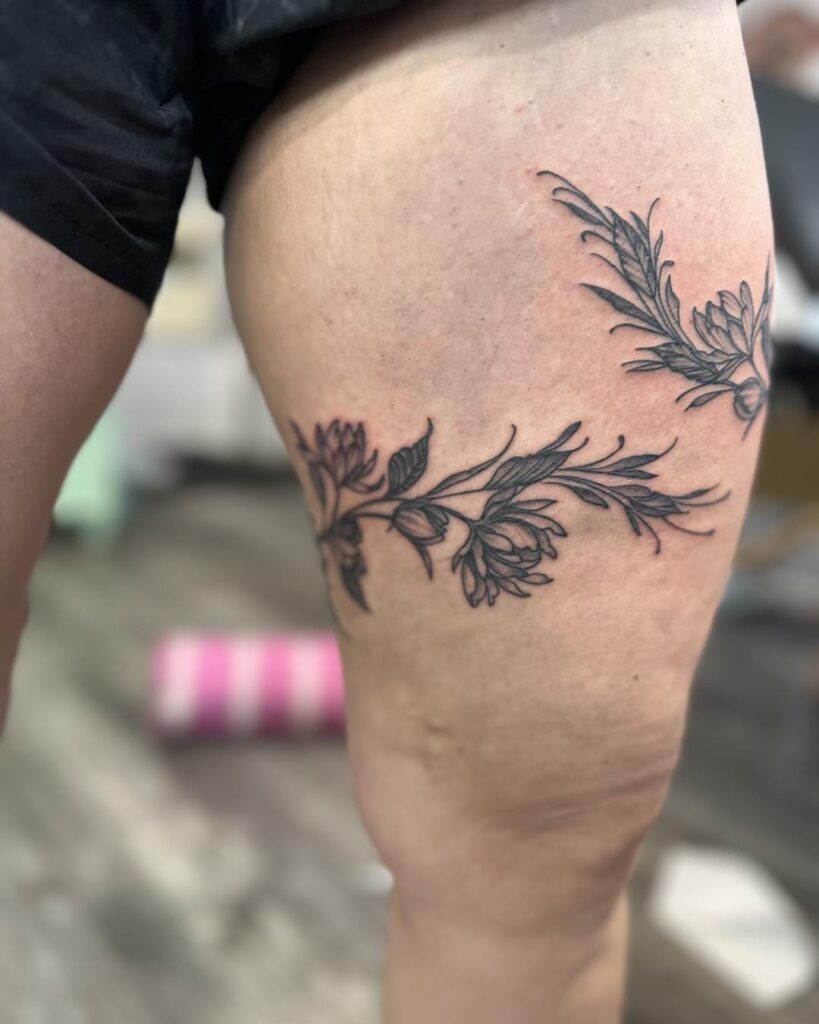 Delicate branches and leaves flow naturally around the thigh, creating a graceful band that mimics nature’s rhythm. The tattoo features soft shading and fine lines, giving it a realistic and elegant look.
