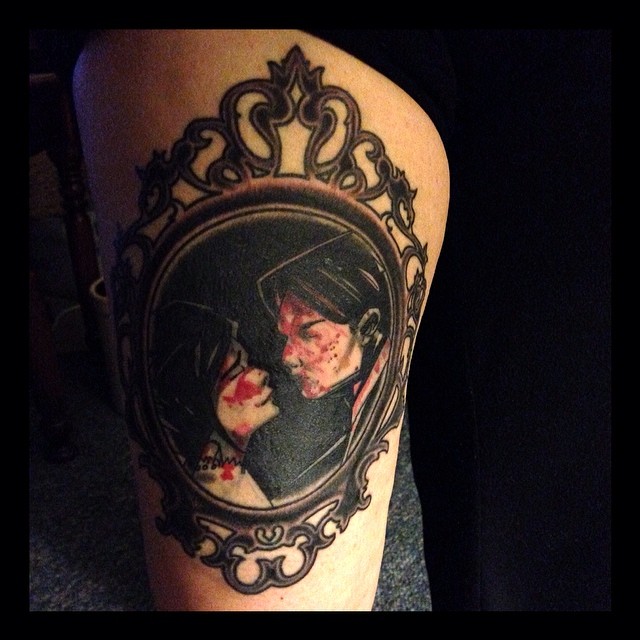 5. Gothic Portrait Frame Thigh Tattoo
