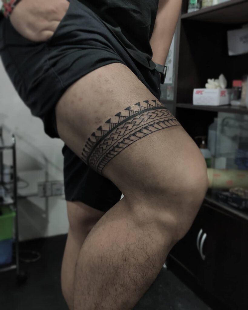 7. Geometric Tribal Thigh Band Tattoo