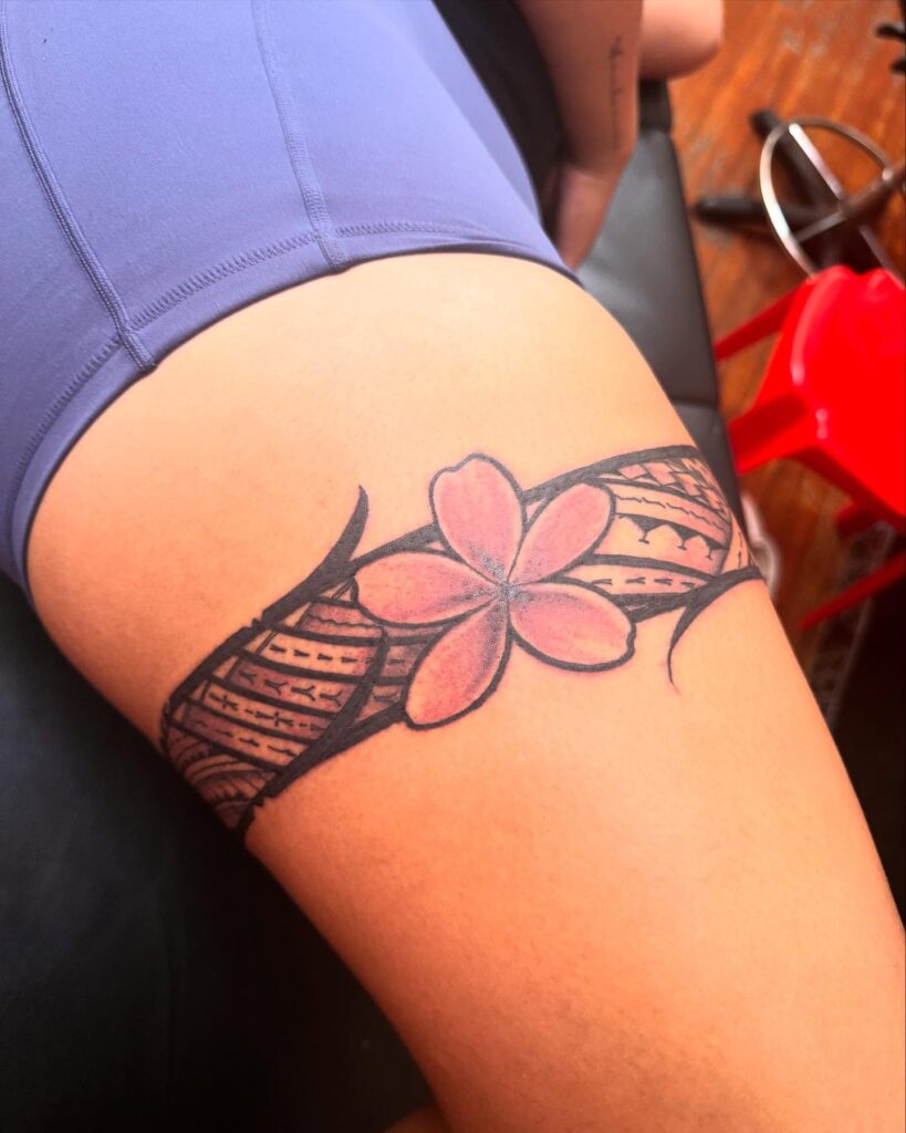 This design combines bold Polynesian tribal motifs with a delicate pink flower centerpiece, creating a perfect balance of strength and softness. The band encircles the thigh with detailed black ink patterns, each line and curve symbolizing tradition and heritage.