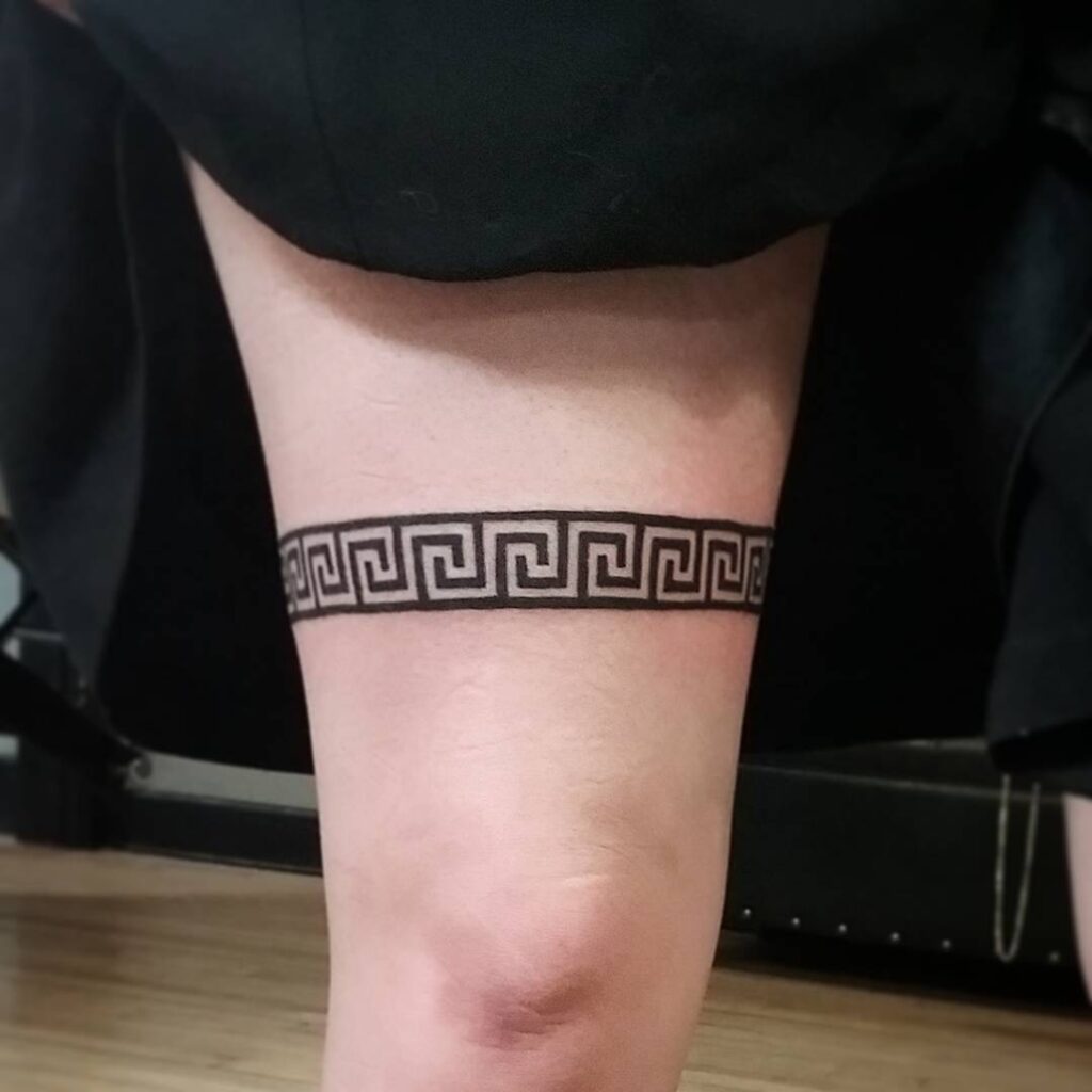 11. Greek Key Pattern Thigh Band Tattoo