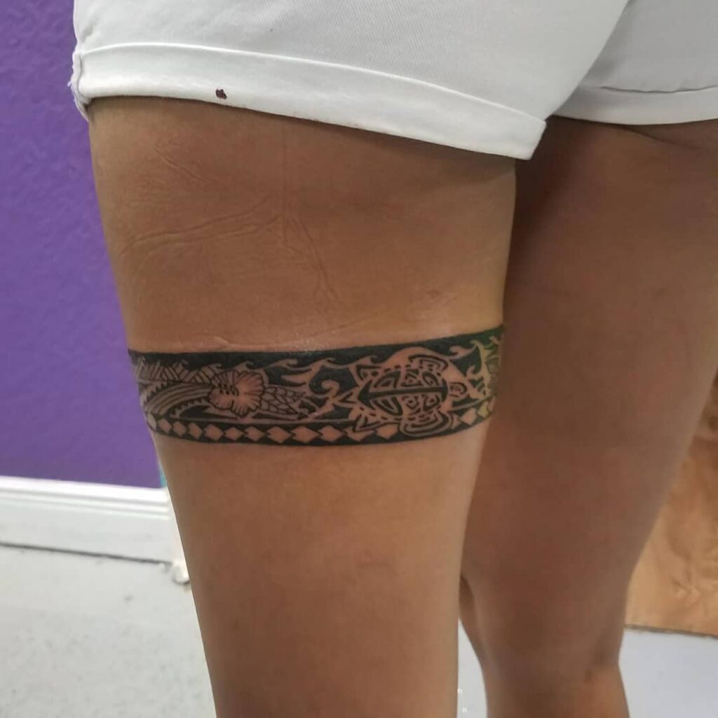 1. Polynesian Floral Thigh Band Tattoo