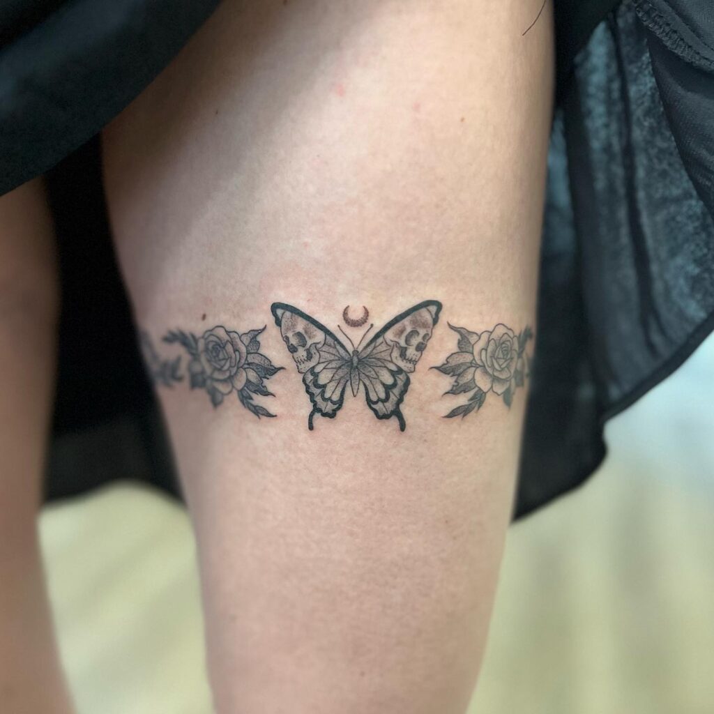 A delicate band tattoo centers on a butterfly, its wings detailed with skull imagery, flanked by roses on each side. The crescent moon above adds a mystical touch, blending beauty with deeper symbolism.