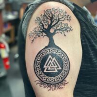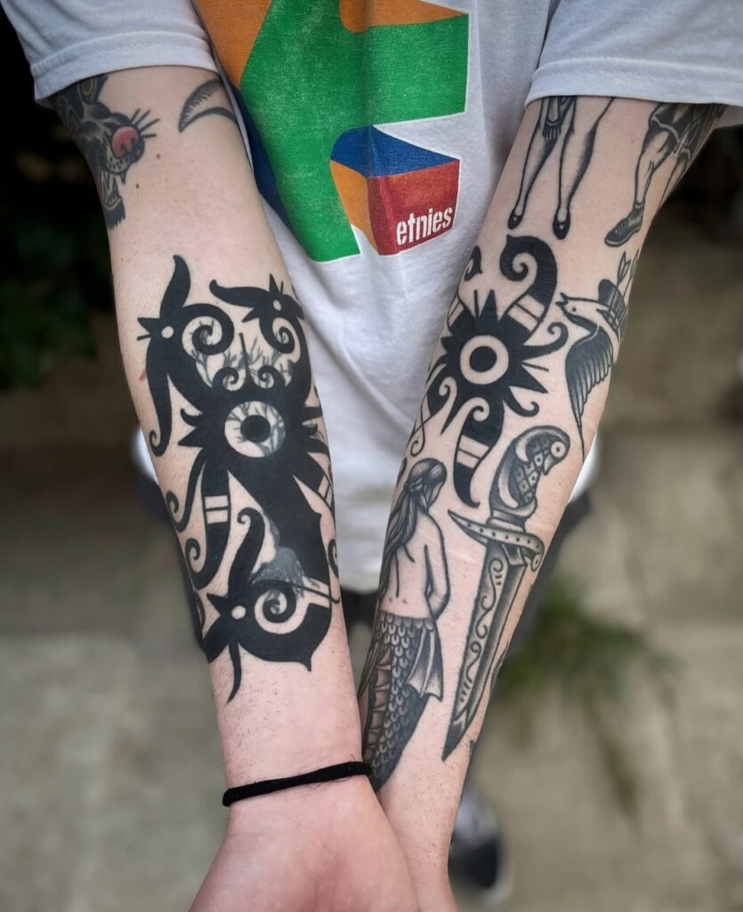 Placed prominently on the forearms, it draws instant attention and projects strength and intensity. The incorporation of circular and spiral motifs suggests cycles, energy, and awareness, giving the tattoo a deeper symbolic layer while standing as a striking piece of body art.