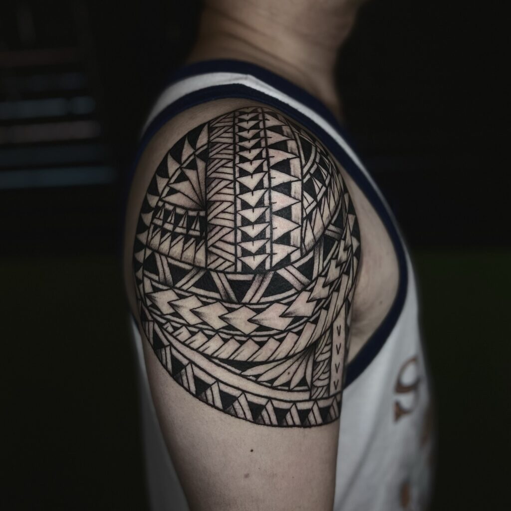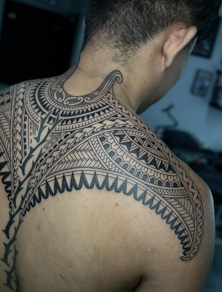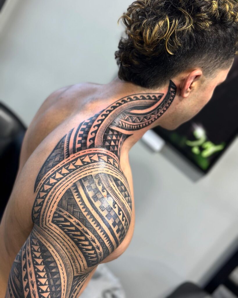 This expansive tattoo flows seamlessly from the back, across the shoulder, and up to the neck. Its design is built from Polynesian-style patterns—geometric rows, arrow motifs, and interlocking triangular shapes—that honor traditional warrior tattoos while embracing modern precision.