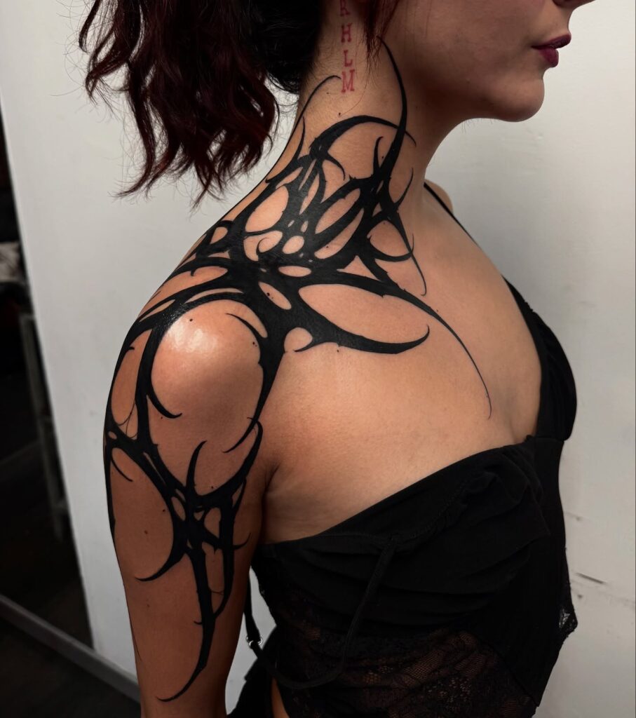 This bold tribal tattoo stretches from the shoulder to the side of the neck, built from thick, web-like strokes of black ink. The sprawling lines connect in a sharp, abstract pattern that radiates intensity and dramatic visual impact.