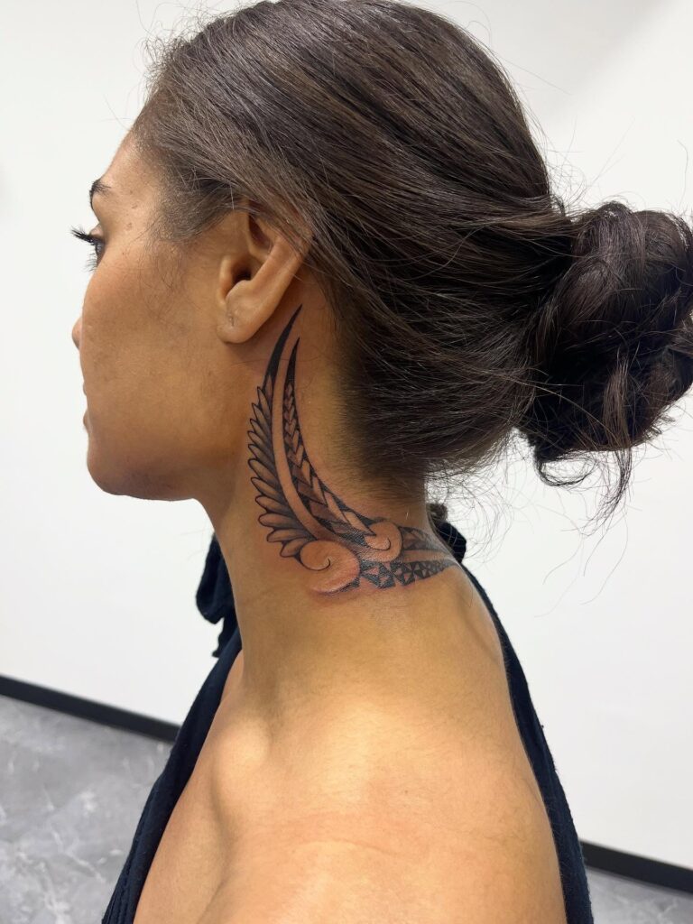 This tribal tattoo placed along the side of the neck uses wing-inspired patterns to create a graceful yet powerful effect. With sweeping curves, feather-like extensions, and intricate line work, it blends traditional tribal elements with a modern, artistic placement.