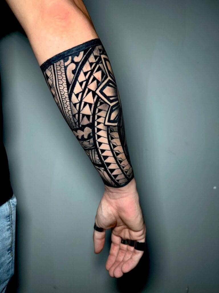 The elongated placement accentuates the length of the forearm, creating a visually striking piece that feels both protective and decorative. With its heavy black ink and meticulous detail, this tattoo represents endurance and timeless tribal artistry.