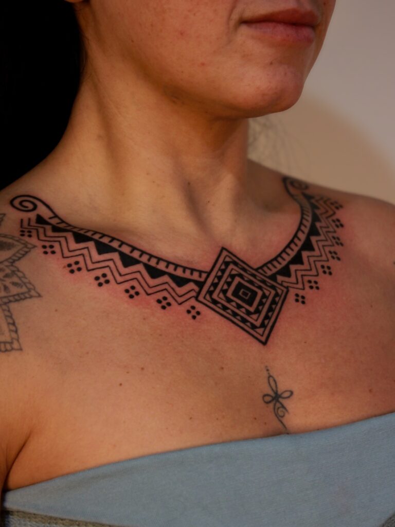 This tattoo mimics the look of an ornamental necklace etched across the collarbone, featuring zigzag patterns, squared spirals, and dotted accents. The geometric style creates a symmetrical, decorative effect that feels ceremonial and bold.