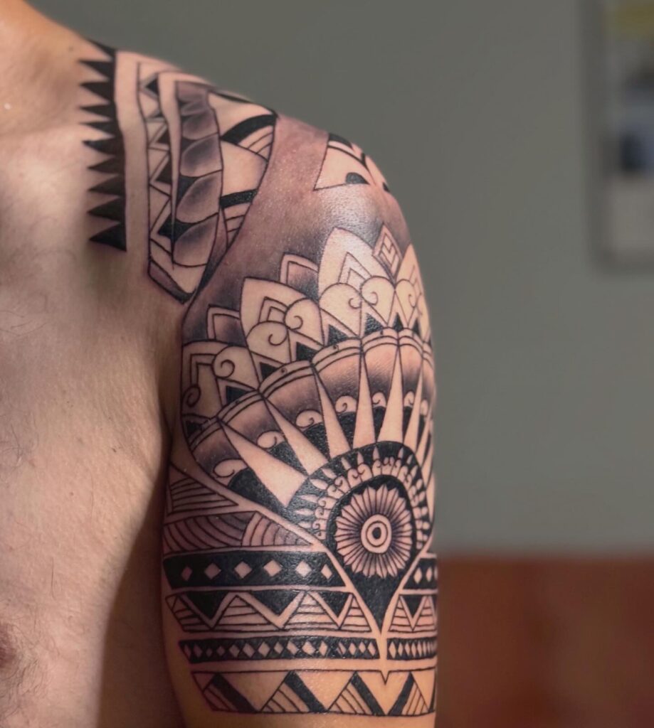 6. Tribal Shoulder Mandala Fusion Tattoo